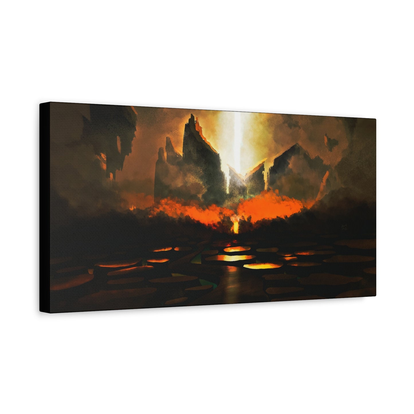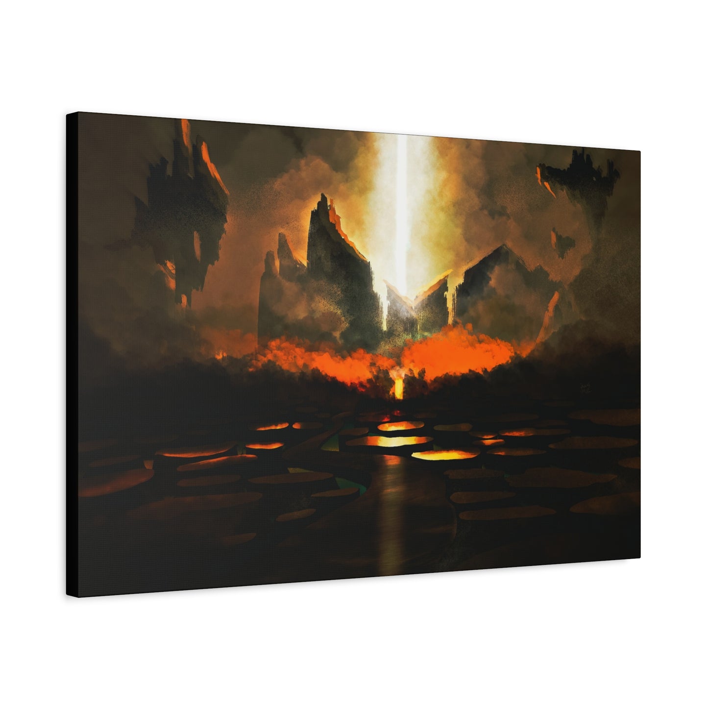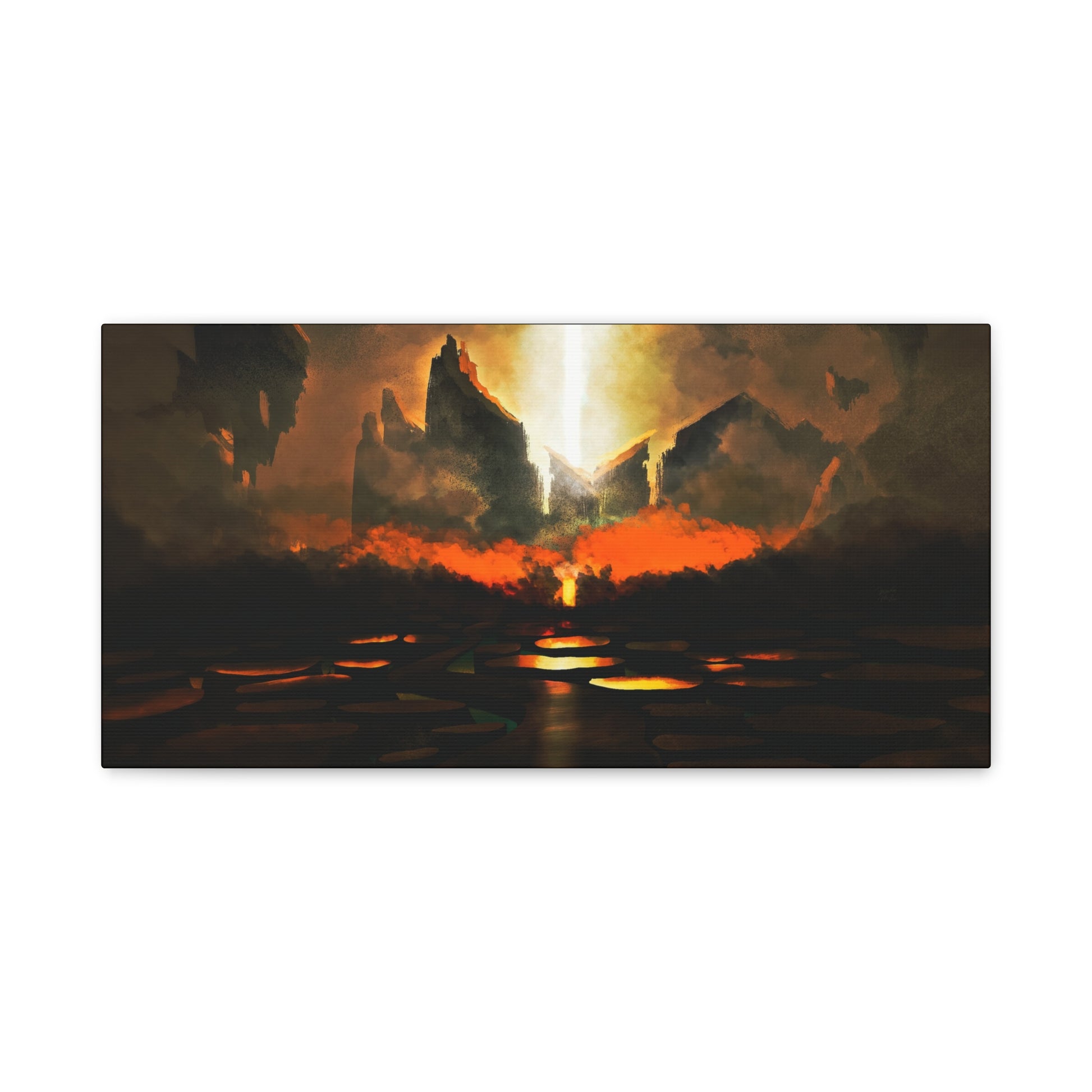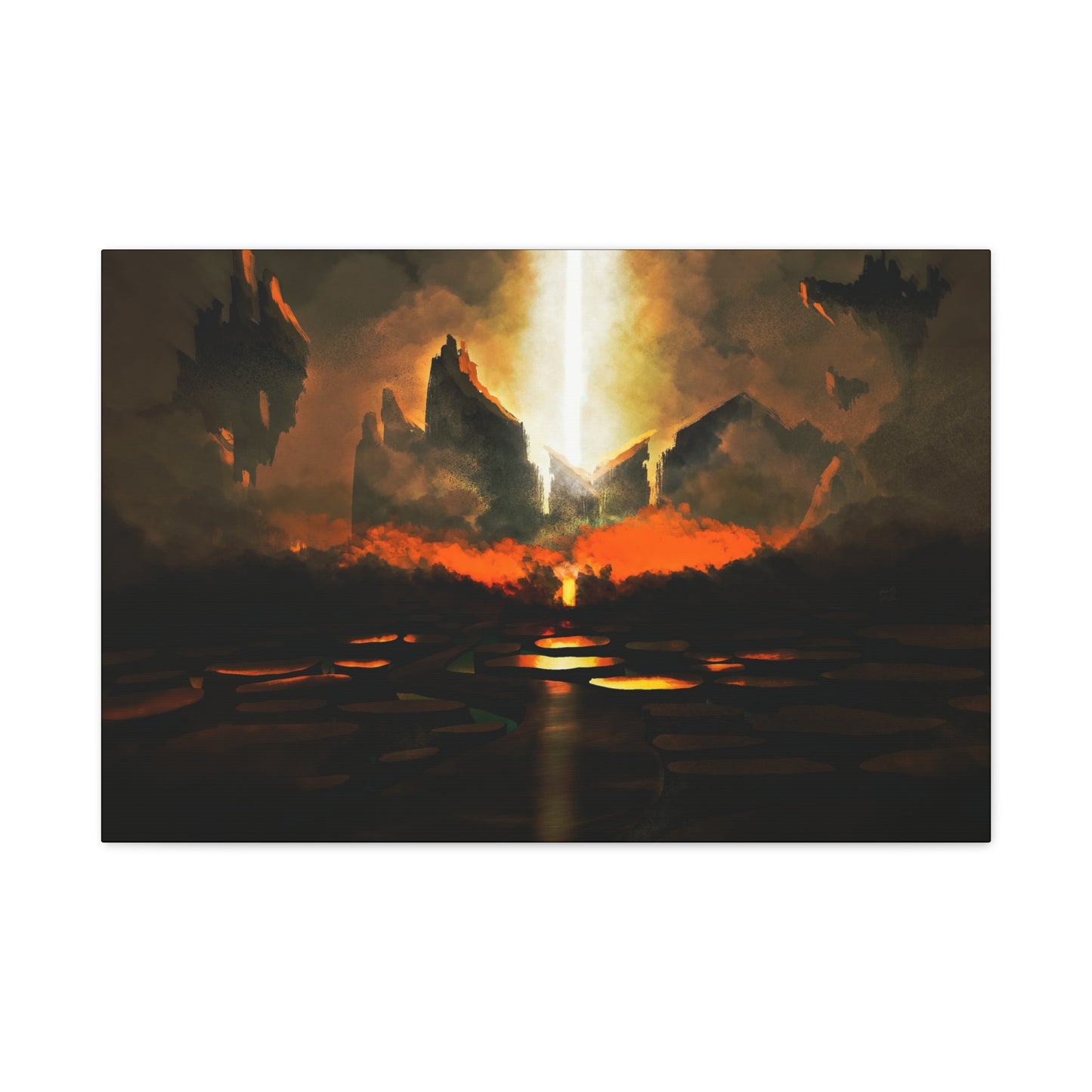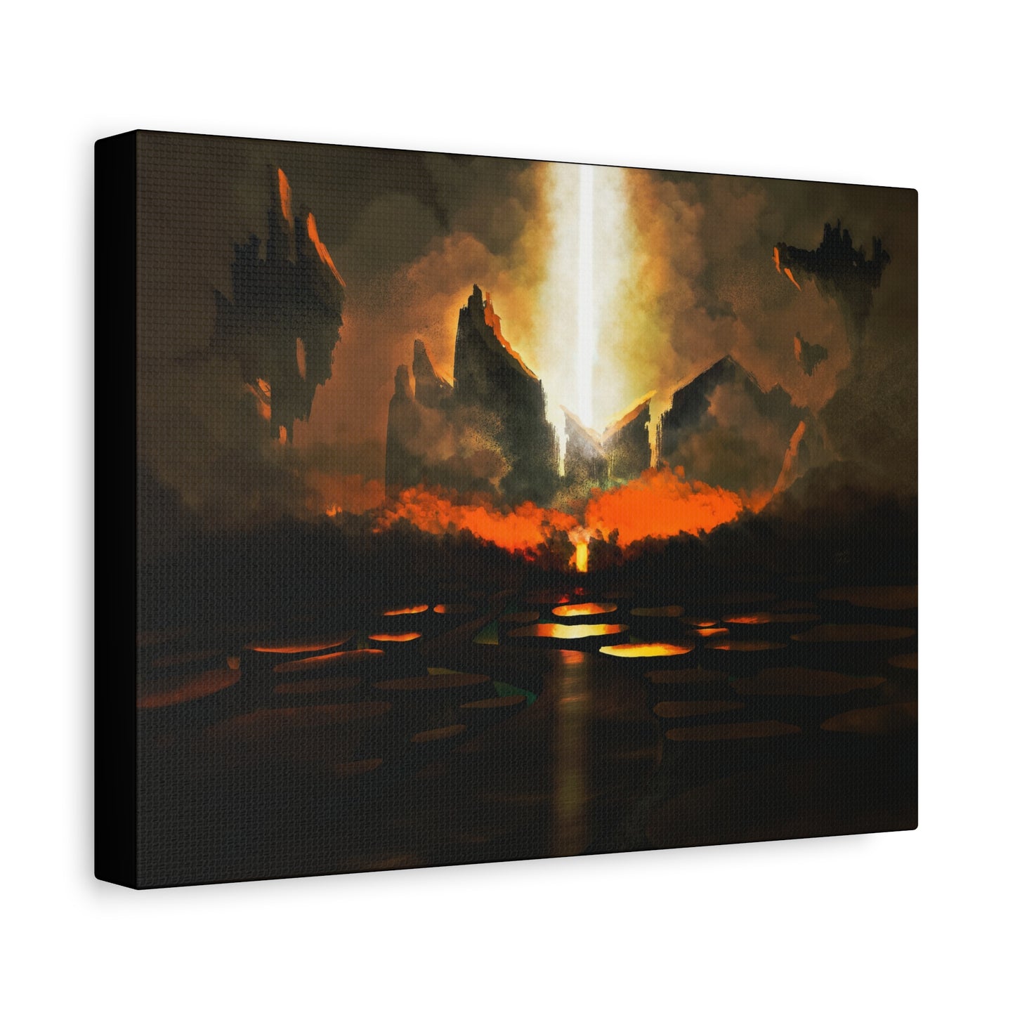 Step into the heart of an apocalyptic vision with The Gates of Darkness Shall Not Prevail. This powerful canvas captures a biblical battle between divine light and encroaching chaos. Towering blackened cliffs frame a radiant shaft of light tearing through the heavens—symbolizing God's unshakable authority piercing the forces of darkness.